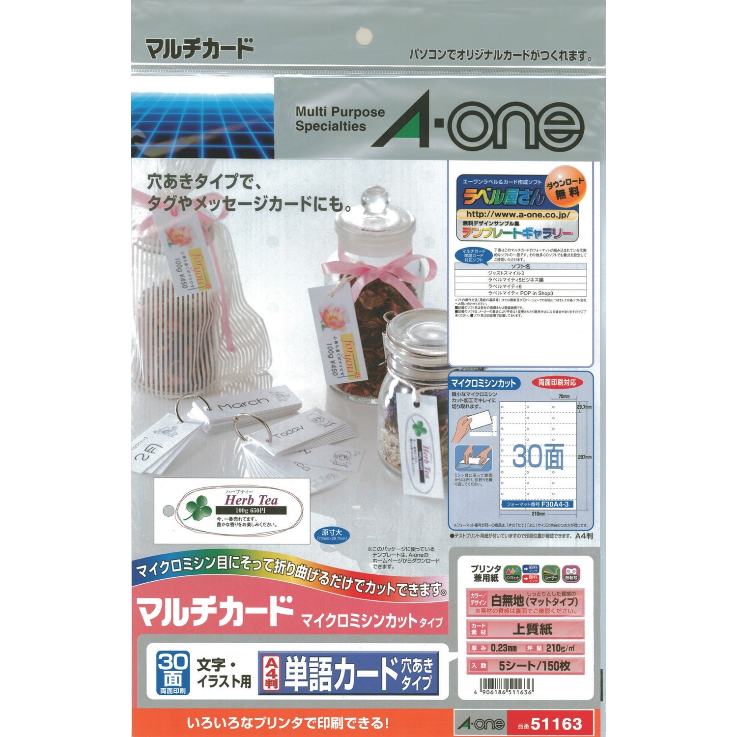 白無地 A4判 30面 単語カードサイズ 穴あきタイプ