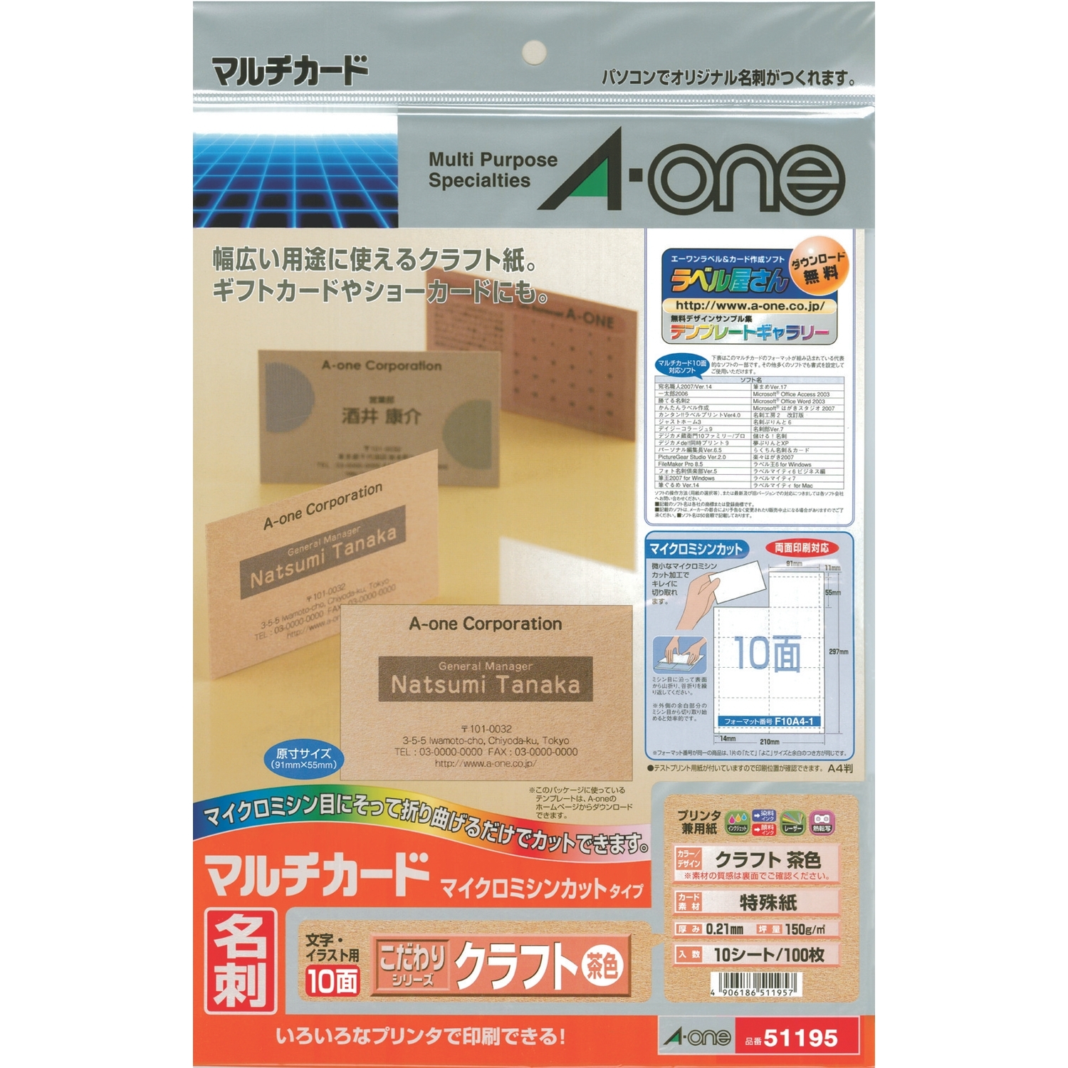 クラフト 茶色 A4判 10面 名刺サイズ